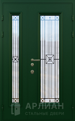 Двустворчатая входная дверь в частный дом со стеклом и решеткой №18